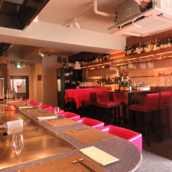 ◆カップルシート◆目の前で職人のダイナミックな調理が見られる特別なお席です。中でも、『フランベ』演出は圧巻。指先から放つ炎のエンターテイメント。是非このカップルシートでご堪能ください。また、店内は赤を基調としたおしゃれな空間です。記念日、デート等、様々な用途でご利用いただけます。